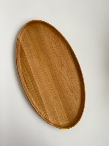 "Тарелка овальная фигурной резки из древесины американского дуба. Отлично подходит для использования в интерьере, как поднос или ваза для фруктов.